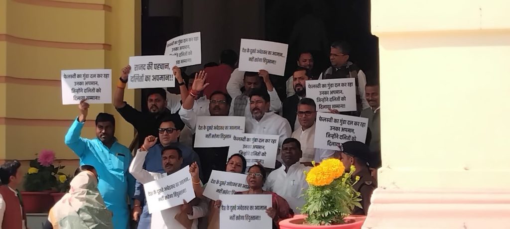 राजू तिवारी कहलनि जे नेता प्रतिपक्ष तेजस्वी यादवक दलक एक नेता अपन वक्तव्य मे गरीब-गुरबाक मसीहा रामविलास पासवान लेल अपमानजनक शब्दक प्रयोग कएने छथि। ई कदापि सह्य नहि अछि। हुनका सदन मे उपस्थित भए समस्त सदस्य सभक समक्ष क्षमा याचना करबाक चाही। हुनकर ई कथन समाप्त होइतहि विपक्षक विधायक अपन-अपन हाथ मे तख्ती लए कए ठाढ़ भए गेलाह आ जोरदार विरोध दर्ज करबय लगलाह। एहि पर सत्तापक्षक सदस्य सेहो उग्र भए उठलाह। सदनक वातावरण अत्यंत उग्र आ तनावपूर्ण बनि गेल।